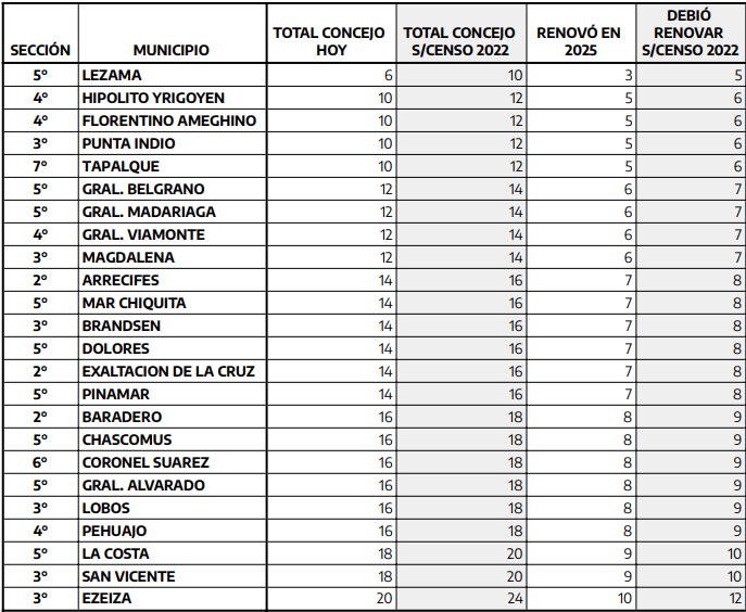 El decreto de convocatoria 639/2025 sostiene que se elegirán un total de 1.097 concejales titulares y 706 suplentes. Al analizar caso por caso los Municipios subrepresentados, se advierte que en estos comicios se deberían elegir 26 concejales titulares y 18 suplentes más. Es decir que en total deberían elegirse 1.123 titulares y 724 suplentes.